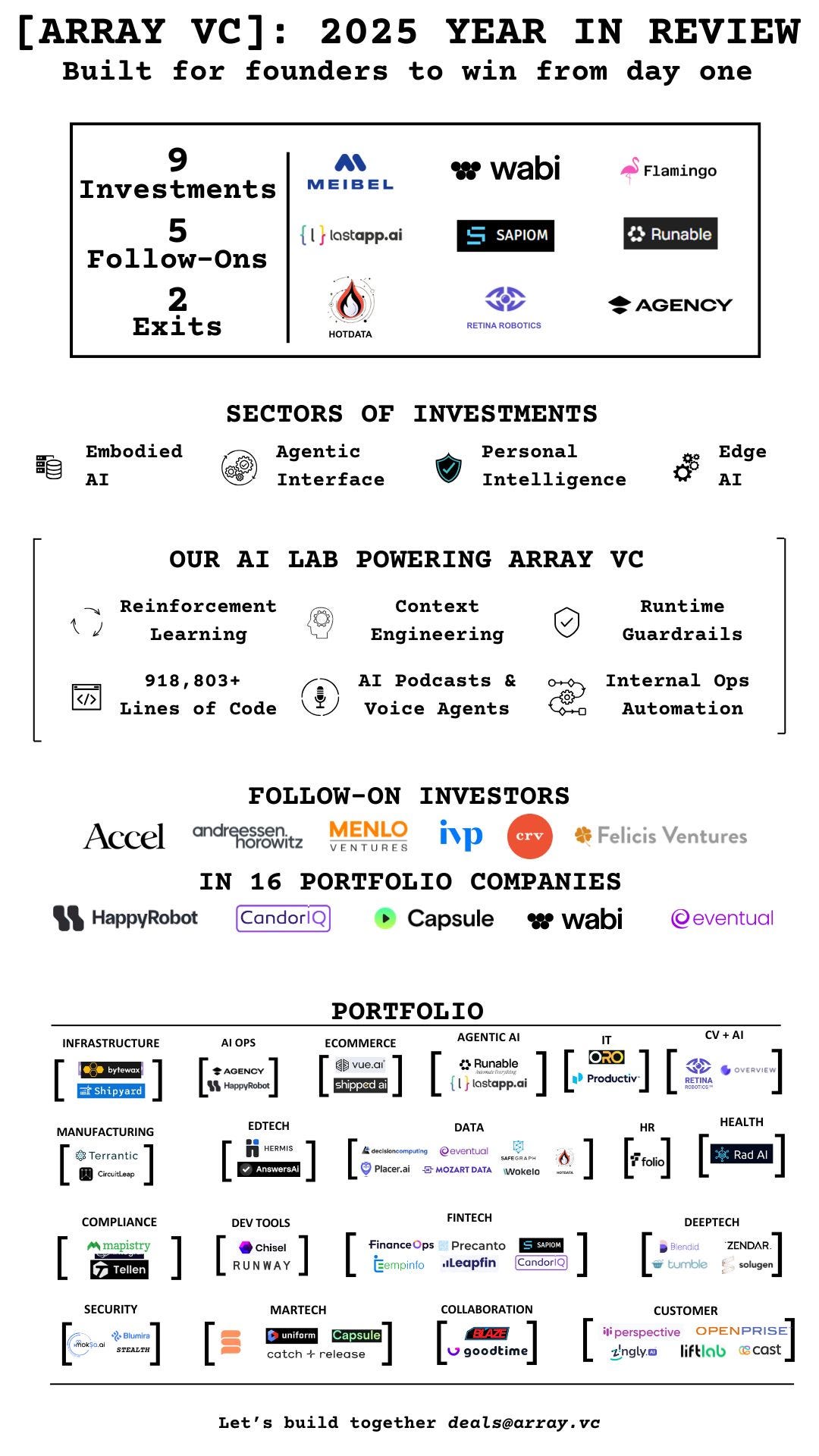 Email us your decks at deals@array.vc 2025 is a wrap and excited for what’s coming in 2026! 2025 was full of milestones from launching our new website array.vc to our Array AI Lab, to making 9 new investments, 5 follow-on investments!